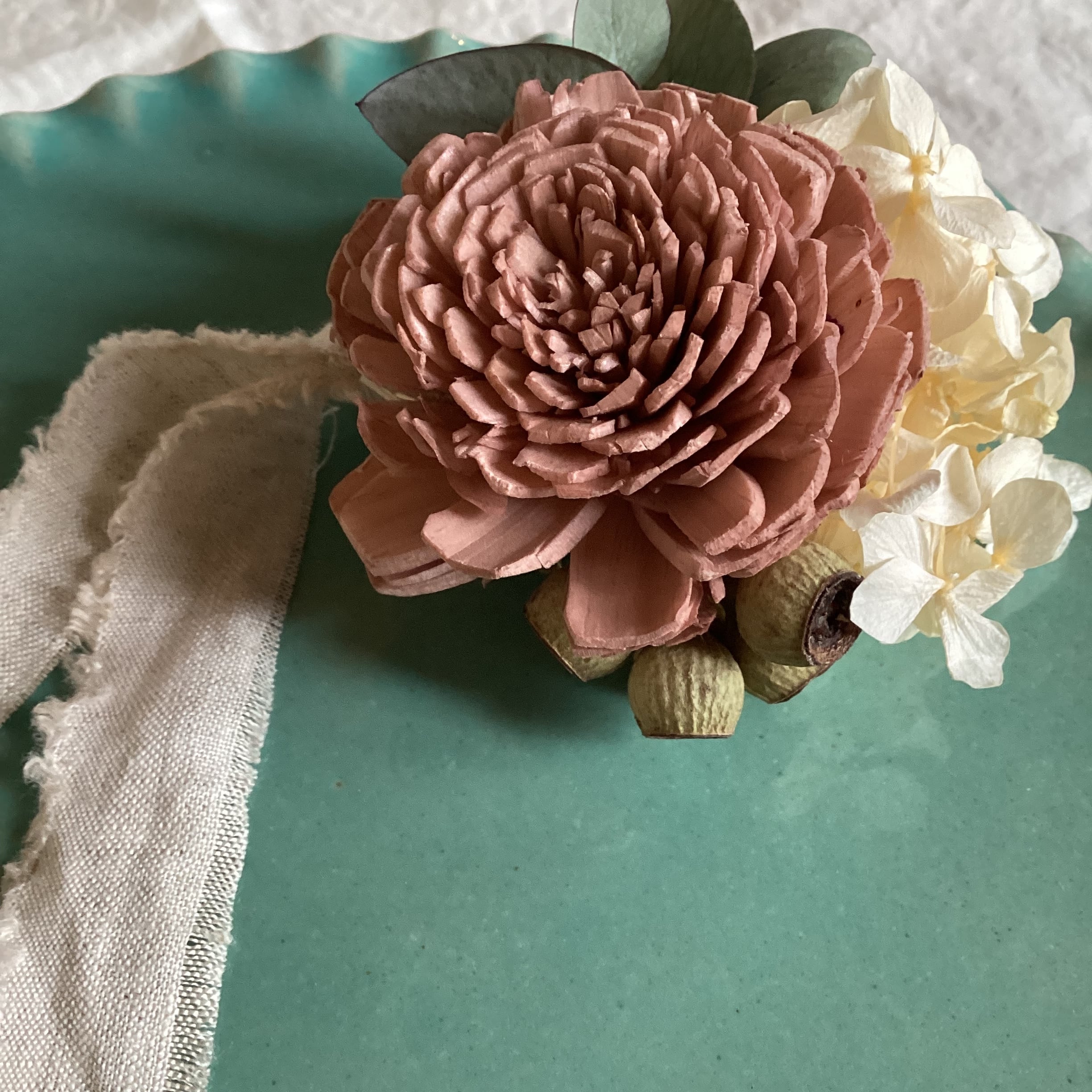 ・ソーラーローズ、アジサイ(プリザーブドフラワー)、ユーカリの葉